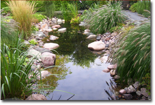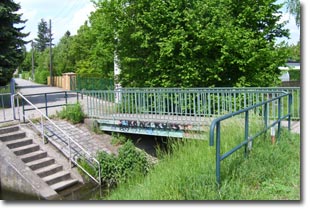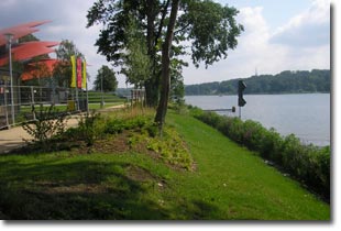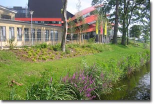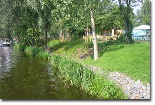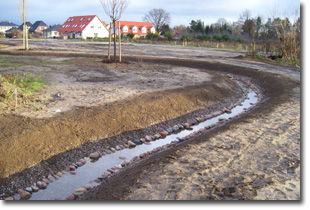 Naturnahe Ausgestaltung eines Wasserlaufs mit Findlingen, Schilf- und Binsenbepflanzung |